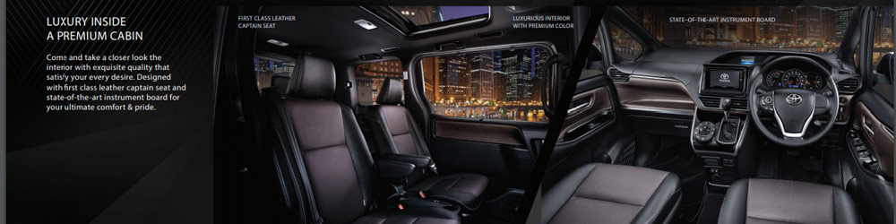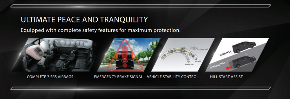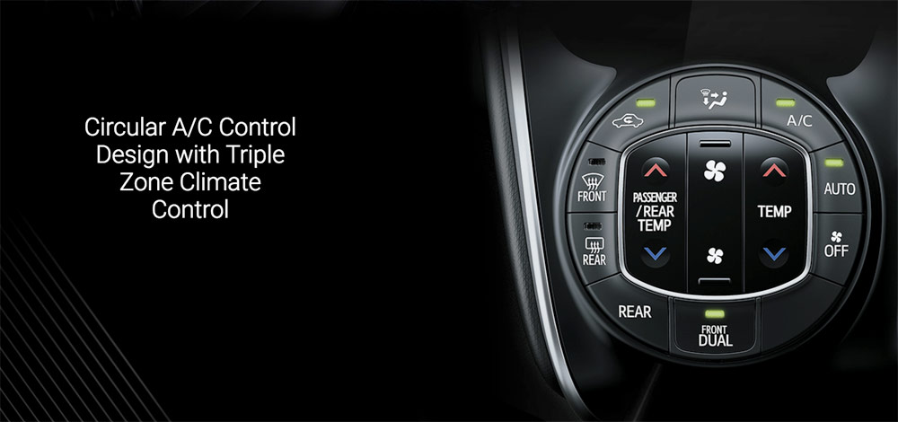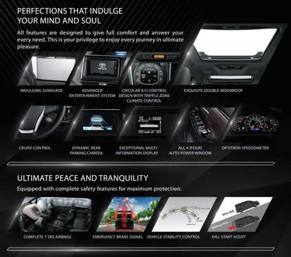 | Kenyamanan | • Luxury Inside A Premium Cabin • Circular A/C Control Design with Triple Zone Climate Control • Optitron Speedometer • Exceptional Multi-Information Display • All 4 (Four) Auto Power Window • Advanced Entertainment System • Cruise Control • Exquisite Double Moonroof • Indulging Sunshade • Cutting Edge Front Design • Majestic Rear Design • Elegant Aero Package • High Ground Clearance for Confidence |